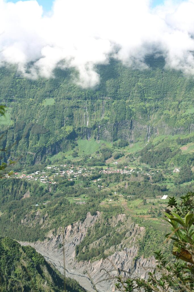 A plus de 900 m d'altitude, le village d'Hell-Bourg (à gauche), de l'Ilet à Vidot (à droite) et la forêt de Terre Plate à plus de 1300 m (en haut à droite)