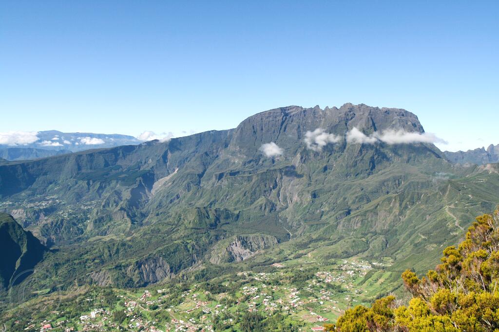 De la boucle, au sommet du piton Enchaing, des vues panoramiques sur le Cirque de Salazie et les sommets environnants. A droite, le Col des Boeufs et le Morne de Fourche (2267 m)